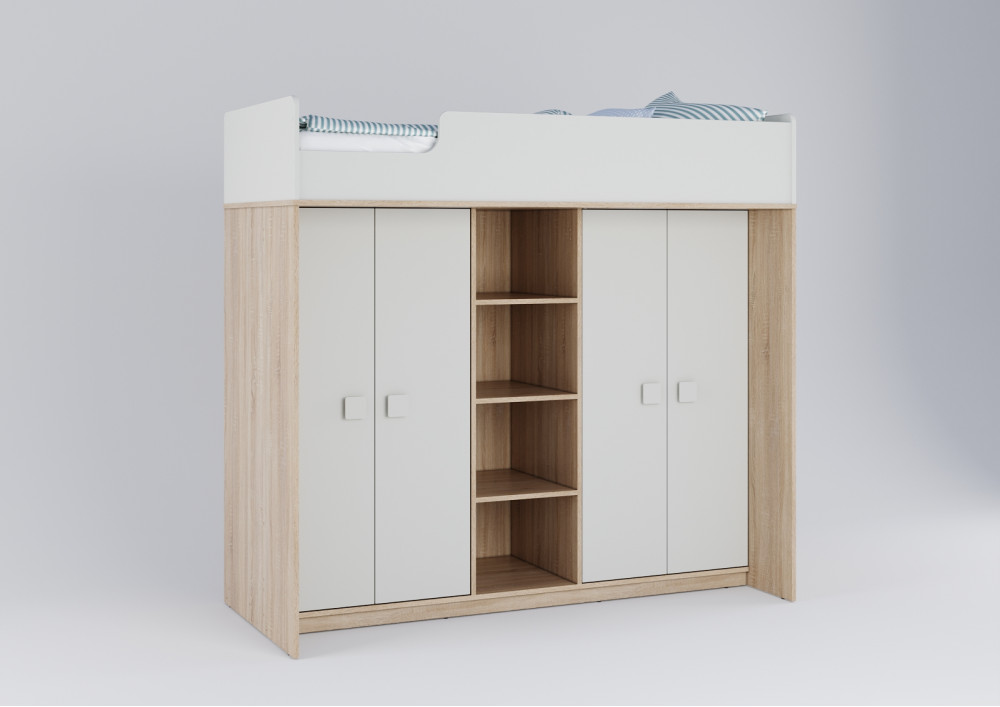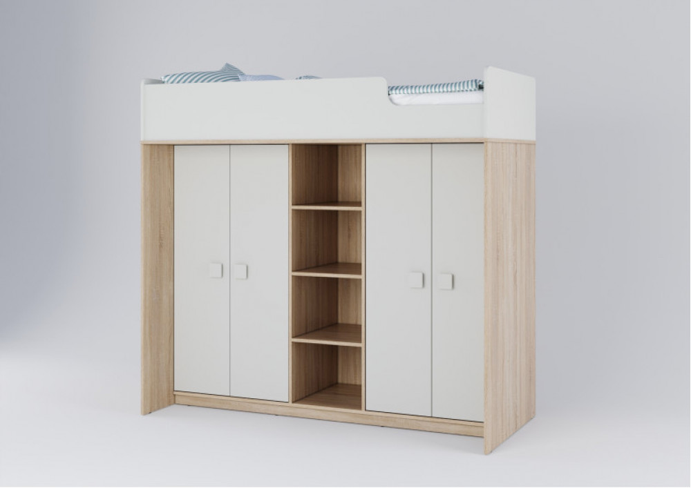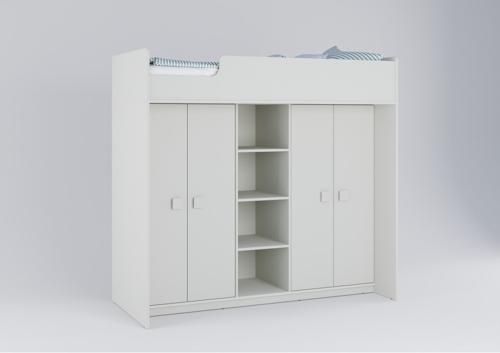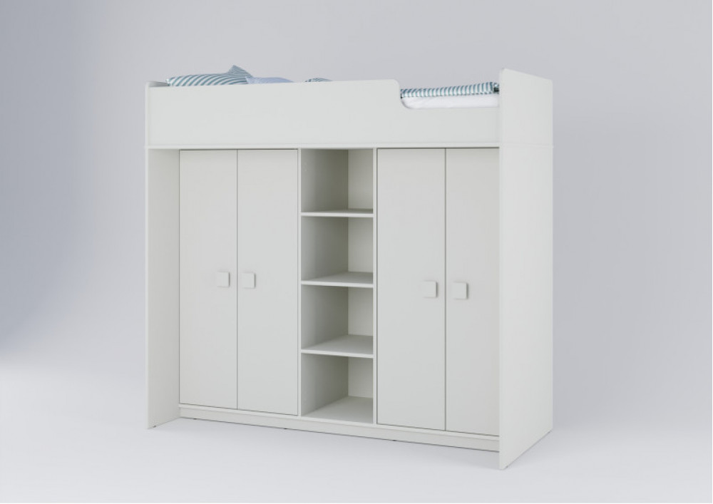 Под спальным местом располагаются два вместительных шкафа и стеллаж между ними для хранения одежды, белья, игрушек или иных вещей.